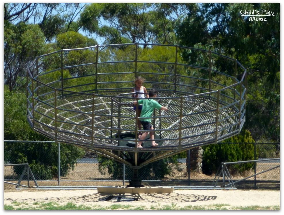 And this:Merry-go-round roundabout  at Katanning All Ages PlaygroundThis merry-go-round is powered by running “up hill” so it spins in the opposite direction. Get it moving and it spins for ages.